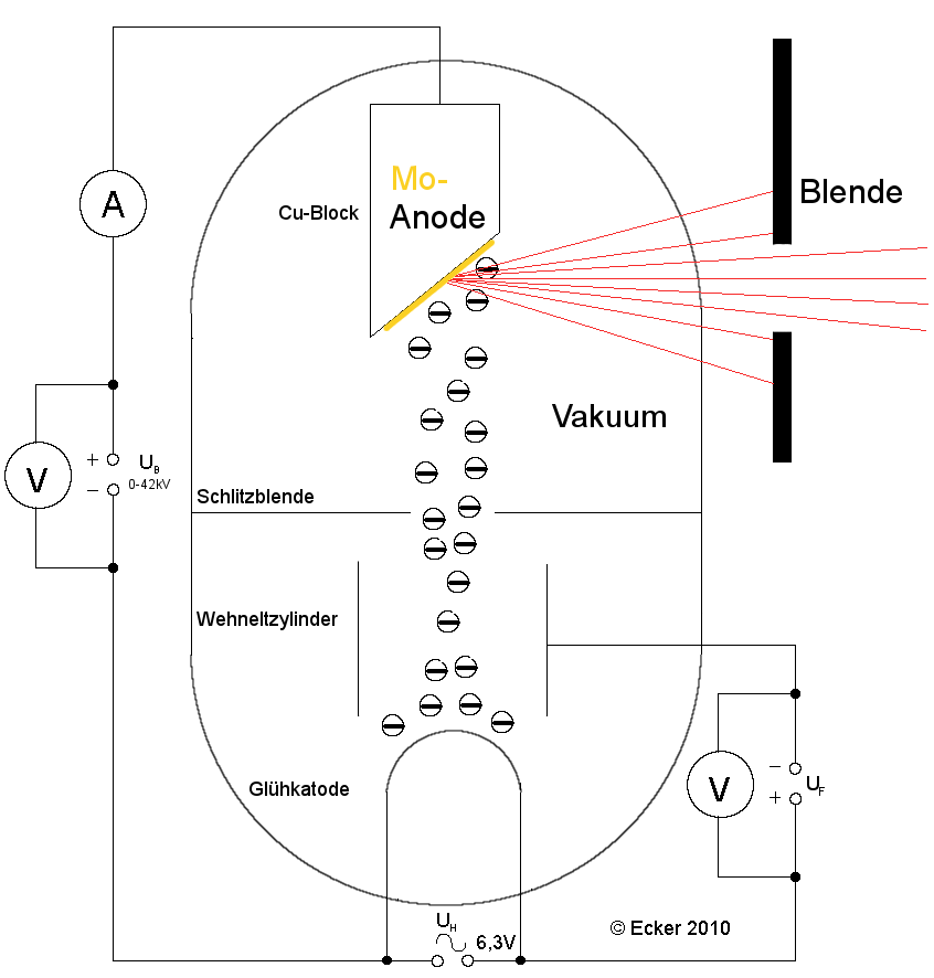 abgebremst, indem sie auf einen Metallelektrode treffen. Diese so erzeugte Röntgenstrahlung