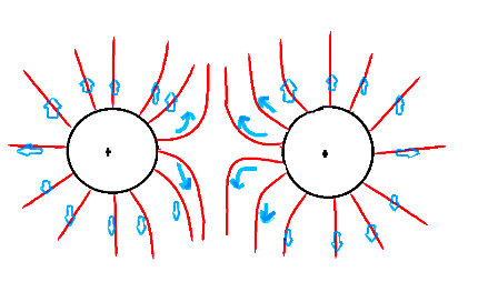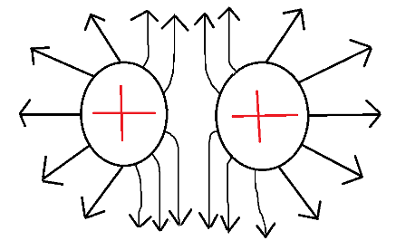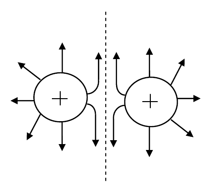 Zwei positiv geladene Körper stoßen sich ab. Die Richtung der Feldlinien wird durch die Kraft auf eine positive Probeladung festgelegt.